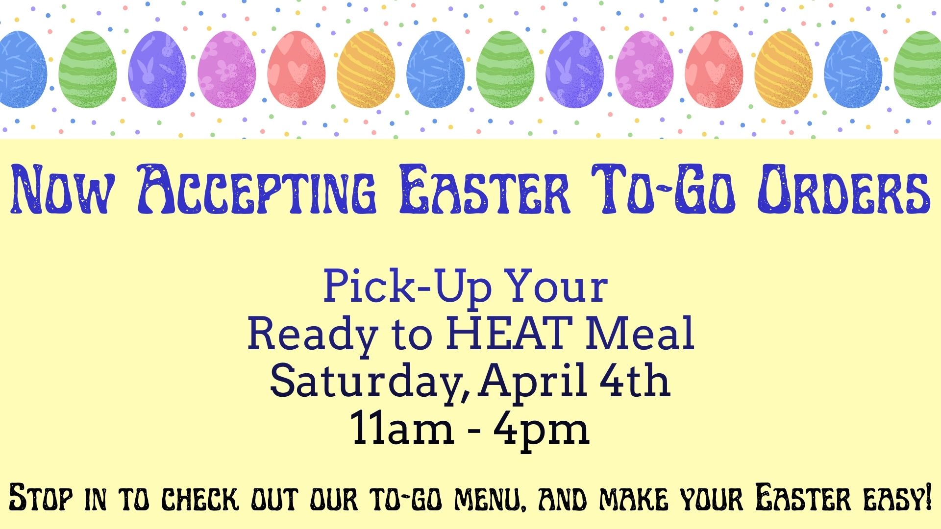 This year our to-go menu includes baked ham or roast beef dinners, various flavors of quiche, ham & cheese strata, fresh mashed potatoes, New York style cheesecake, and many more delicious options!
